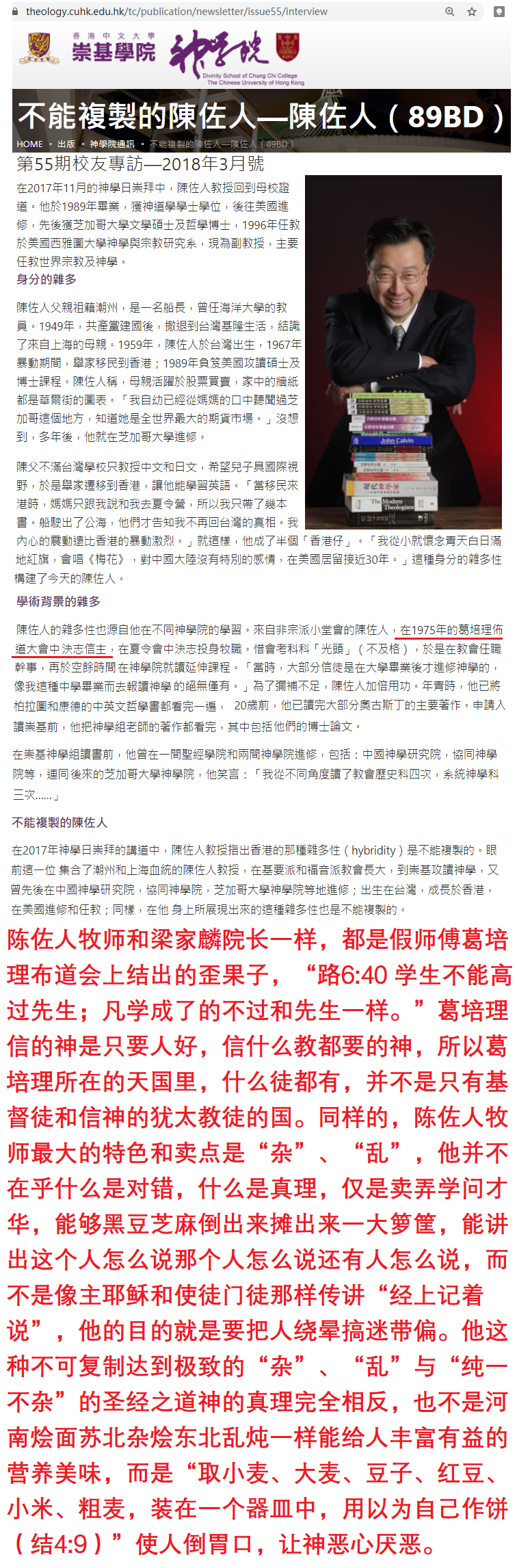 從陳氏的社交媒體自拍的照片,幾分憔悴一絲淒涼,令人心痛,雖然神學功夫天下第一,也不得不象乞丐一樣仰望土財主唐崇榮博士賞個饅頭吃。平時,陳佐人牧師對唐博士還是忠心的,從陳佐人為唐博士做的六十大壽廣告片,可以知道他對財主唐崇榮博士是由衷的頎賞。可惜這馬屁拍在馬腿上,人們也是從這個廣告片瞭解到唐博士榮耀聖徒光環下的資產階級腐朽墮落淫靡奢侈敗壞生活方式,過慣了苦日子的窮信徒們大開眼界之餘,也被驚得目瞪口呆。這個廣告片也成了毀唐者最常引用的素材之一,讓唐博士體驗了一下“箴26:10 雇愚昧人的,與雇過路人的,就象射傷眾人的弓箭手。”