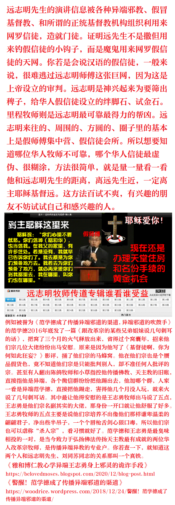 按照他們改革宗最大的腕之一王志勇牧師的說法,他們改革宗與拜鬼通靈的靈恩派是同感一靈弟兄相愛撼山河。所以可以基本上肯定感動范學德認了個神作“阿爸”的靈,就是靈恩派邪靈,是撒但魔鬼(約8:44;徒13:10)。從范學德後來的果子,把各種異端邪教的神親切到肉麻露骨地推崇,把它們都當成基督教的神傳揚讚美歌頌,可以證明,范學德認的假爸爸神就是靈恩派邪靈魔鬼撒但。范學德以為自己撿了個爸爸,占了大便宜,卻不知道是認賊作父、以撒但魔鬼為神,當然他所說的主耶穌也是假基督。